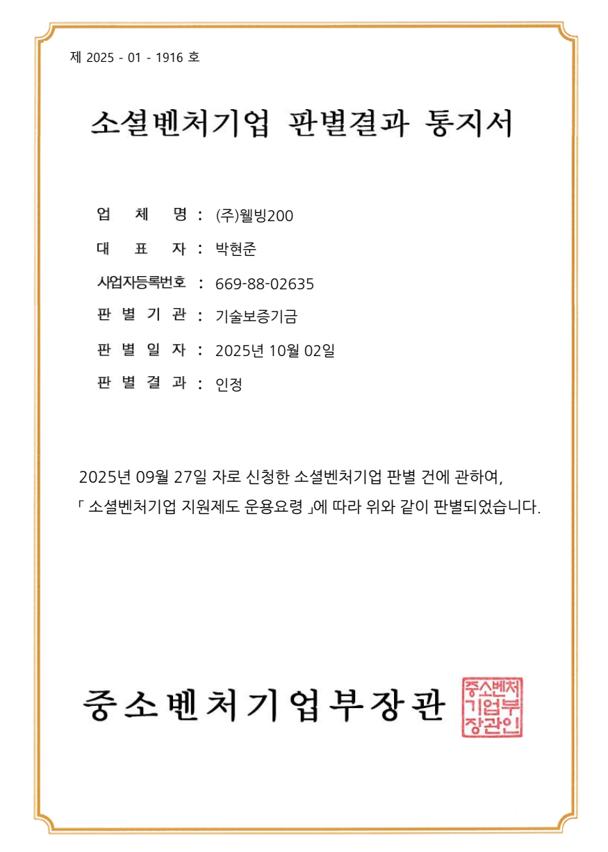 웰빙200은 중소벤처기업부로부터 소셜벤처 판별을 받은 기업으로, 사회적 가치와 경제적 가치를 동시에 추구하는 혁신 기업입니다. 특히 웰빙200은 초고령화 사회의 가장 큰 과제 중 하나인 치매 예방을 핵심 미션으로 삼아, 천연물 기반의 그린바이오 식품을 개발을 통해 건강한 삶을 지키는 데 연구개발하고 있습니다.